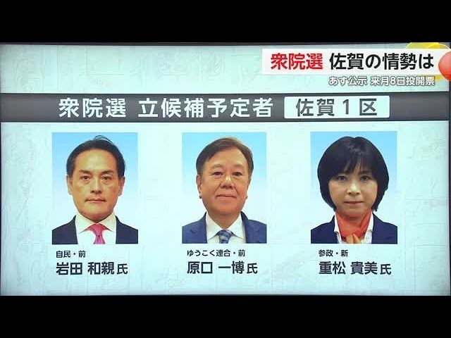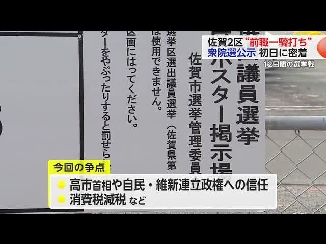 【佐賀1区】ゆうこく・参政・自民三つ巴 【佐賀2区】自民・中道一騎打ち 衆院選公示 (26/01/27 12:00)