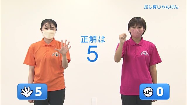 TOP 記事一覧 ライフ 足し算ジャンケン ~たのしみ体操~ ライフ life 2022.07.14 足し算ジャンケン ~たのしみ体操~ 足し算ジャンケン かけごえに合わせてジャンケンをする (かけごえ:足し算ジャンケンジャンケンポン) グー・チョキ・パーで足し算をする 先に答えの数だけ拍手をして解答した方が勝ち グーは0 チョキは2 パーは5 例え:「パー」と「グー」だった場合、「5+0」で正解は「5」になります。 この場合、"先に5回拍手をした後「5」と早く答えた人が勝ち"になります。 足し算じゃんけんジャンケンポン♪ チョキ パー チョキ 2 + パー5 7回拍手! 「7」と言う! 左の人がパーなので「5」右の人がチョキなので「2」足して「7」となります。 7回拍手して「7」と答えた左の人が勝ちになります。 勝ったら「So good!」のポーズです。 上手くいかないことも丸ごと楽しみましょう! 【2022年7月12日放送 かちかちPress たのしみたい操より】 TAG LIST #たのしみたい操 #かちかちPress 前の記事 一覧に戻る 次の記事 RECOMMEND