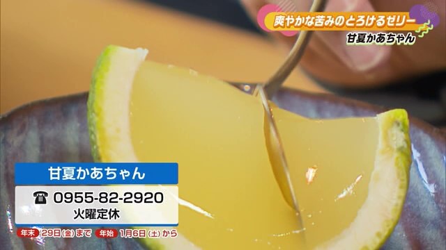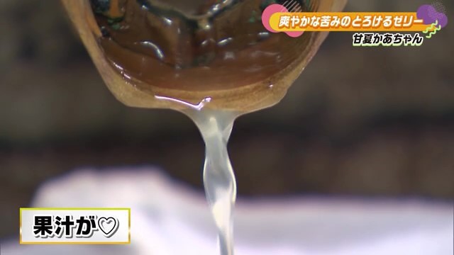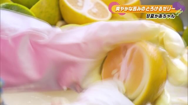 TOP 記事一覧 ピックアップ 皮が器の夢甘夏ゼリー!こだわりの製法は?唐津市「甘夏かあちゃん」 ピックアップ pickup 2024.01.04 皮が器の夢甘夏ゼリー!こだわりの製法は?唐津市「甘夏かあちゃん」 唐津市呼子町加部島にある「甘夏かあちゃん」 甘夏を使ったゼリー「夢甘夏ゼリー」を製造しています。 夢甘夏ゼリー 皮が器の甘夏ゼリーです。 誕生して33年のロングセラー商品です。 サイズは「M」「L」「2L」があります。 一番大きい「2L」はソフトボール大の甘夏を使用しています。 製造工程 甘夏を丁寧に洗う 皮を器に使用するため、3段階で丁寧に洗います。 1回目・2回目は手作業で洗い、3回目は洗浄機で洗っています。 甘夏をカット 中身をくりぬく 半分に切ります。 中身をくりぬく作業も見せていただきました。とても早い職人技です! 挑戦させてもらいましたが、少し実が残ってしまい、作業も遅くて難しい作業だとわかりました... 器が完成しました! 甘夏の皮を器に使おうと思ったのは甘夏の程よい苦み・香りを生かそうと思ったのがきっかけだそうです。 くりぬいた甘夏の果肉から果汁をしぼる 苦みや雑味が出ないように優しく圧縮します。 果汁が出てきました! 特別に搾りたての果汁をいただきました! 爽やかな香りと苦みがおいしいです! こだわりは「甘夏の自然の味」で、砂糖の使用は最小限にしています。 いつ食べてもゼリーの糖度が一定になるように、異なる季節に収穫した果汁をブレンドしています。1年間を通して糖度が16度になるように調整しています。 果汁に砂糖・凝固剤などを加えて皮の器に注ぎ 冷やし固める 表面に浮いた泡を取り除き、2時間冷やし固めると完成です! 完成したゼリーがこちらです。 ぷるるんとしています。 口に入れるとあっという間に消えて、酸味などの風味が鼻から抜けていきます。 甘夏そのものの味です。 甘夏ソルベ 2023年5月に登場した新商品です。 ゼリーと違った良さがありますが、ゼリー同様で爽やかでおいしいです! 甘夏かあちゃん TEL : 0955-82-2920 定休日 : 火曜 【2023年12月28日放送 かちかちPress 工場walkerより】 関連記事 嬉野に"コストコ"!?コストコ商品が並ぶ「ミニコス 嬉野店」Part.1【食品】 食べ応え抜群のごぼう天!唐津市「うどん髙浜や 唐津店」Part.1 こだわりの漬け刺身!唐津市の鮮魚店「うおや吉田屋」 濃厚ウニパスタ!唐津を五感で感じられる空間 唐津市「青天堂」 ※各記事に掲載している料金やサービスについては、記事を掲載した時点での情報になります。掲載当時から料金やサービスが変更になっている場合がございます。 TAG LIST #スイーツ #唐津市/東松浦郡 #工場walker #かちかちPress 前の記事 一覧に戻る 次の記事 RECOMMEND