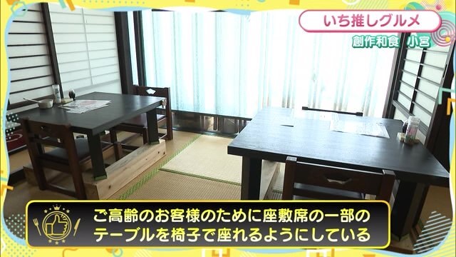 TOP 記事一覧 グルメ 総菜食べ放題!おかずがすすむ土鍋ごはん!「創作和食 小宮」【佐賀市】 グルメ gourmet 2024.07.12 総菜食べ放題!おかずがすすむ土鍋ごはん!「創作和食 小宮」【佐賀市】 佐賀市にある「創作和食 小宮」 掘りごたつ席と、座敷席があります。 ご高齢のお客様のために、座敷席の一部のテーブルを高くして、椅子で座れるようにしています。 充実した総菜コーナー 定食を注文すると、無料でいただけます。 たくさんの種類のお惣菜があります。 ハンバーグととんかつ定食 1,650円 ※土鍋ご飯は2人前以上定食をご注文のお客様から オーナーの方は、ごはんがすすむおかずより、"おかずがすすむごはん"を目指しているそうです。 とんかつは柔らかくておいしいです。 ハンバーグは手づくりのオリジナルソースです。 創作和食 小宮 住所 : 佐賀市東与賀町 営業時間 : 11:30~13:30(L.O) 18:00~20:00(L.O) 定休日 : 月曜日・火曜日 TEL : 0952-97-9618 【2024年7月9日放送 かちかちLIVE いち推しグルメより】 関連記事 「好きな佐賀弁」はなに? 佐賀県民に聞き込みをすると様々な佐賀弁が! こころとカラダが喜ぶ手作りメニュー!「おもてなしごはん。OYOBARE」 大人気のアサイーボウル!こだわりはもちもち食感と盛りだくさんのフルーツ「TKB AWARDS」【佐賀県武雄市】 佐賀初上陸!?『ベアアート』を体験!誰でもできる簡単アート 武雄市「ベアアート佐賀」 ※各記事に掲載している料金やサービスについては、記事を掲載した時点での情報になります。掲載当時から料金やサービスが変更になっている場合がございます。 TAG LIST #かちかちLIVE #いち推しグルメ #佐賀市 前の記事 一覧に戻る 次の記事 RECOMMEND