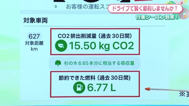 リポーターが特訓した後2週間弱、実際に検証した結果、エコドライブを実践した約2週間で、CO2排出削減量が約16kg、節約できた燃料が約7Lという効果が得られました。これは杉の木約7本分のCO2削減効果に相当します。