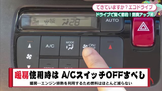 多くの方が見落としがちなのが、A/Cスイッチの使い方です。A/Cスイッチは冷房機能や除湿機能を行っており、「これから冬場にかけて暖房をつける時はA/Cスイッチを切ってもらった方が燃費は向上します」と専門家は説明します。