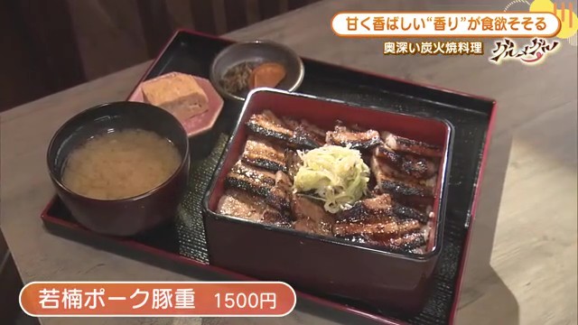 すみまるの一押しメニューは、武雄のブランド豚「若楠ポーク」を使った豚重です。プリプリの食感で、炭で焼くことによって余分な油は落とし、さっぱりと食べられます。それでいて炭の香りが食材にまとわりつき、格別の美味しさを生み出しています。
