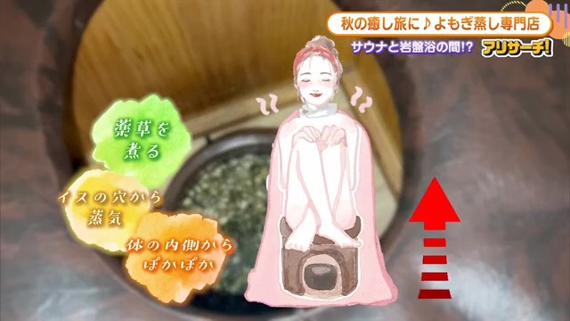 よもぎ蒸しは、約600年以上前から韓国で受け継がれてきた伝統的な温熱療法です。オーナーのゆずりはさんによると、「薬草を煮立たせた蒸気を体の内側から吸収させます。イメージで言うとサウナと岩盤浴の間ぐらい」温熱効果があるとのこと。