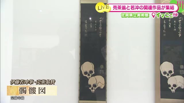「2人の合作の作品も今回展示しています」として、伊藤若冲と売茶翁による「髑髏図」の作品が紹介されています。
