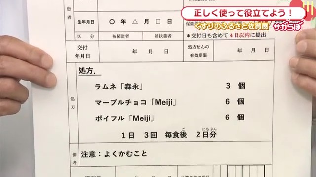 このイベントの目玉の一つが、子どもから大人まで楽しめる調剤体験です。「処方箋の見本にならって、お菓子を使ったかわいい調剤体験ができるんですよ!」とリポーターが紹介するように、実際の処方箋を参考にしながら、お菓子を薬に見立てた調剤体験を行うことができます。