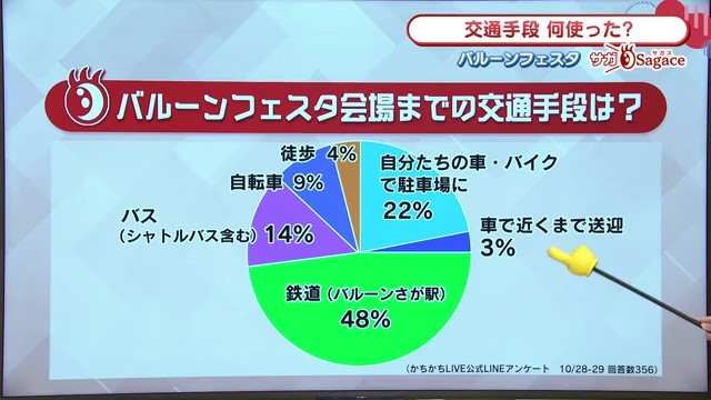 番組が実施したかちかちLIVE公式LINEアンケート(10月28-29日実施、回答数356)によると、バルーンフェスタ会場までの交通手段は以下のような結果となりました。