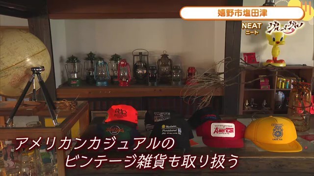 店内に足を踏み入れると、そこは日本の古民家とは思えない異空間が広がります。アメリカンヴィンテージの雑貨がところ狭しと並び、コップやランタン、古着まで、まるでアメリカの古き良き時代にタイムスリップしたような感覚に包まれます。これらの雑貨は全て購入することも可能で、中には「とんでもないお宝もあったりもするんじゃない?」とリポーターが興味深そうに語るほど貴重なアイテムも潜んでいるかもしれません。