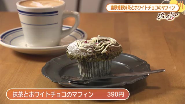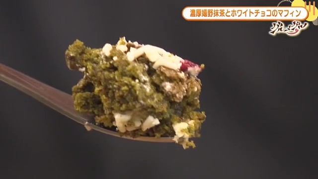 デザートは、抹茶とホワイトチョコのマフィンです。こちらのマフィンは菓子製作室の中村さんが手がけており、「抹茶感を強く出したくて、抹茶の配合はちょっと多めに入れて」作られています。嬉野産の抹茶を使用することで、地元の食材にもこだわりを見せています。