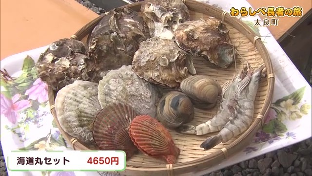 看板メニューの「海道丸セット」には、牡蠣をはじめ、ハマグリやヒオウギ貝、ホタテなど、新鮮な貝類がたっぷり盛られています。