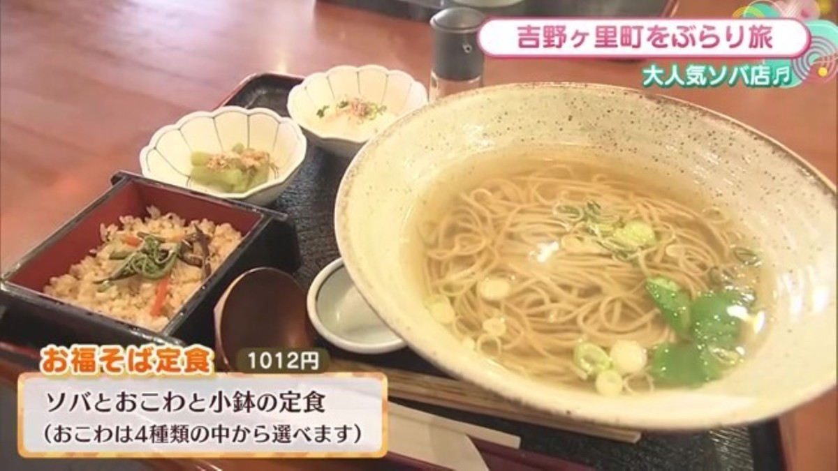 人気メニューは「お福そば定食」。大きな陶器の器に盛られたソバが目を引きます。透明な出汁に浮かぶソバには、ねぎがトッピングされ、彩りも鮮やか。ソバの横には、おこわと小鉢が配置された定食セットが並び、小皿にはお漬物なども添えられています。おこわは4種類の中から選べるそうです。
