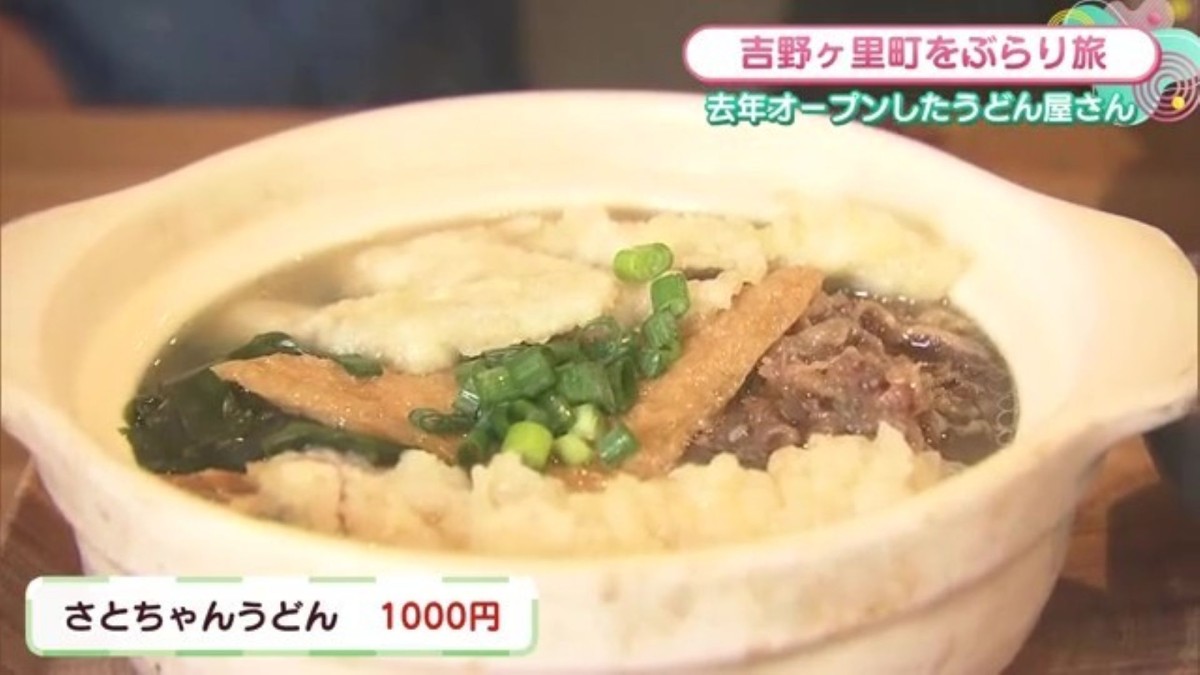 「さとちゃんうどん」は、エビ天、キツネ、わかめ、肉、ごぼう天など、具材が豊富に盛り付けられています。店名の「さと」は店主の名前から来ているそうです。