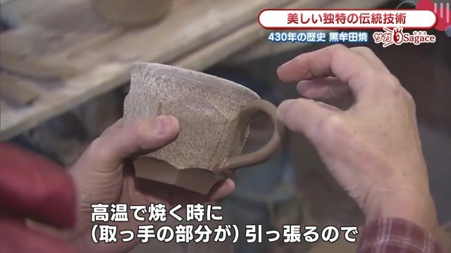 コーヒーカップの取っ手を付ける作業も、黒牟田焼の繊細さを物語る工程の一つです。「これをちょっと逆楕円にするんですよ。高温で焼くので、これが焼いた時に引っ張って来る。この状態にしておけば、ちょうど焼いた時にこれがまん丸になります」。焼成による変化を見越した緻密な計算が、美しい仕上がりを生み出しています。