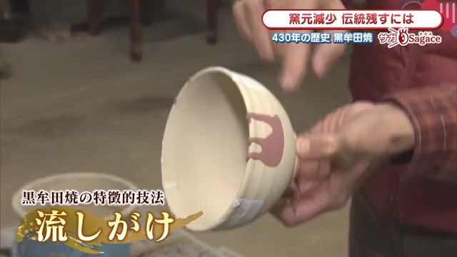 絵付けの工程にも、黒牟田焼ならではの独特な技法があります。「流しがけ」と呼ばれるこの技法は、「このような流しですね。ここにちょっと少量入れまして、ここにかけていきます。このときにこう割れないといけないんですよ。これが難しいんです」と丸田さんが説明するように、高度な技術を要する作業です。