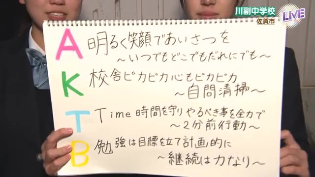 川副中学校では生徒行動目標「AKTB」を掲げ、全校生徒が「こんな川中にしたいよね」という目標を持って学校生活を送っています。その中でも「K:校舎ピカピカ、心もピカピカ〜自問清掃〜」として、自分に問いかけながら清掃を行い、校舎だけでなく自分の心も磨く取り組みを実践しています。