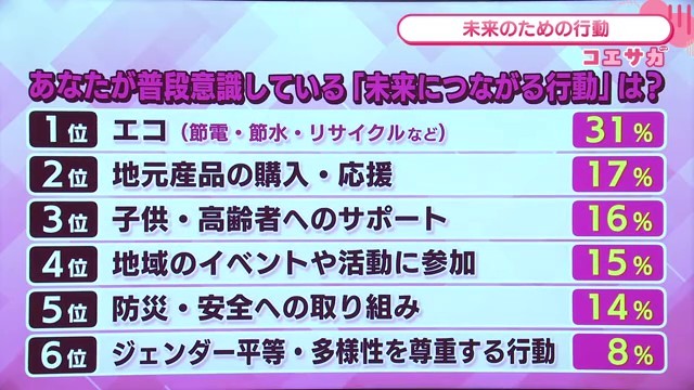 リポーターは「1位はやはり『エコ』で31%!節電やリサイクルなど、身近なところから意識されていますね。そして注目なのが、2位の『地元産品の購入』や、3位・4位の『人や地域へのサポート』です。『環境』だけでなく、『地域経済』や『人とのつながり』を大切にすることが、良い未来につながると考えている方が多いようです」とコメントしました。