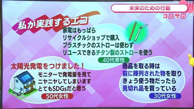 50代女性からは「太陽光発電をつけました!モニターで発電量を見てニヤニヤしてしまいます。とてもSDGsだと思う」という声が届きました。この「ニヤニヤしてしまう」という表現に注目したリポーターは、「『我慢しなきゃ』じゃなくて、『発電して得したな』とか『リサイクルショップでいいの見つけた!』って楽しむこと。これこそが、長く続ける一番のコツかもしれません」と解説しました。