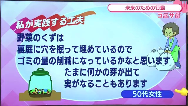 生ごみ削減の工夫として、50代女性から驚くほどシンプルな方法が紹介されました。「野菜のくずは裏庭に穴を掘って埋めています。ゴミの量の削減になっているかなと思います。たまに何かの芽が出て実がなることもあります」という投稿です。