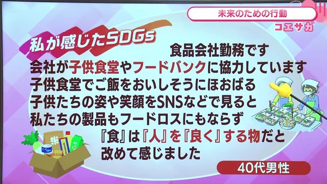 食品会社勤務の40代男性からは、「会社が子供食堂やフードバンクに協力しています。子供食堂でご飯を美味しそうにほおばる子供達の姿や笑顔をSNS等で見ると、私たちの製品もフードロスにもならず、『食』は『人』を『良く』する物だと改めて感じました」という声が届きました。