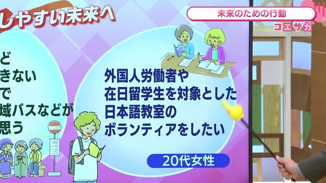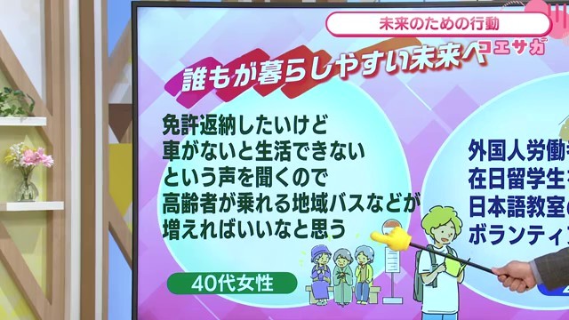 この声についてリポーターは「一見行政への要望のようにも見えますけど、実はこれ、SDGsの目標⑪『住み続けられるまちづくりを』そのものなんです。車が運転できなくなっても、その土地に住み続けられるようにする。誰一人取り残さない交通手段を整えることも、佐賀の未来を守るための大切なアクションなんですね」と解説しました。