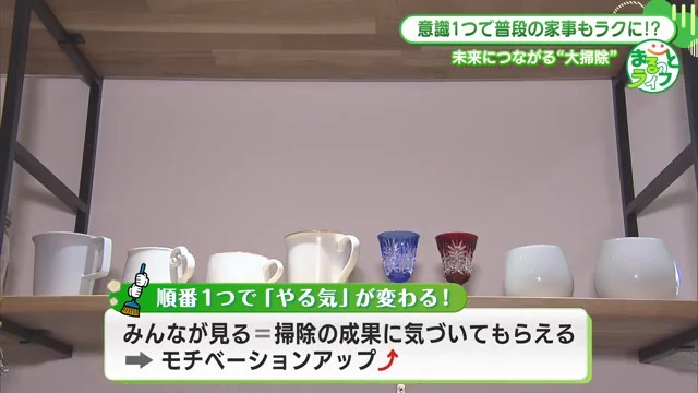 なぜこの順番が効果的なのでしょうか。蒲原さんは「掃除がやりたくないっていうのって結構気持ちが関わってる部分が多くて、みんなが見てるところからやると気づいてもらえる。自分自身もモチベーションが上がって、褒めてもらえたからやろうかなってなる」と説明します。