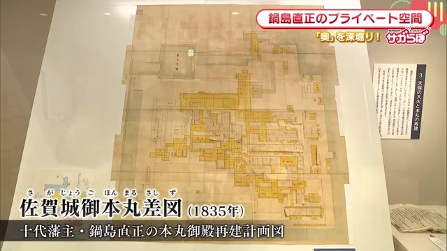展示されている1835年の「佐賀城御本丸差図」は、十代藩主・鍋島直正の本丸御殿再建計画図です。この絵図には、江戸時代2度の火災後に鍋島直正が再建した佐賀城の詳細が描かれており、当時直正がプライベートな生活をしていた場所も明記されています。