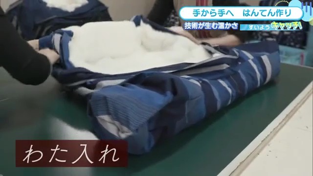 はんてん作りで最も重要な工程の一つが「綿入れ」です。手でちぎった綿を、厚みを入れたい部分には増し方で入れ、背中の部分にも計算して配置していきます。「2人の息が合ってないとうまくいきません。やっぱり手で塩梅(あんばい)を見てやっていきます」という職人の言葉通り、この工程は完全に人の手と感覚に頼った作業です。