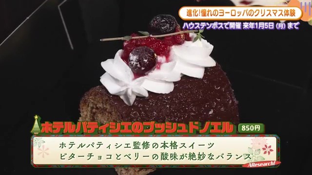 スイーツメニューとして、見た目から可愛らしいクリスマスロールケーキも登場。「生地しっとりしてる。チョコレートのビターのほろ苦さとベリーの酸味がちょうどいい。すごくいいバランス」と評価され、「丸1本分ぐらいは食べられそうなぐらい」の美味しさです。
