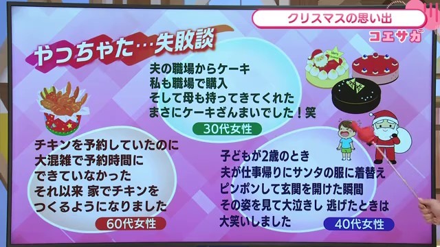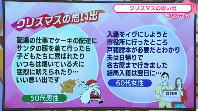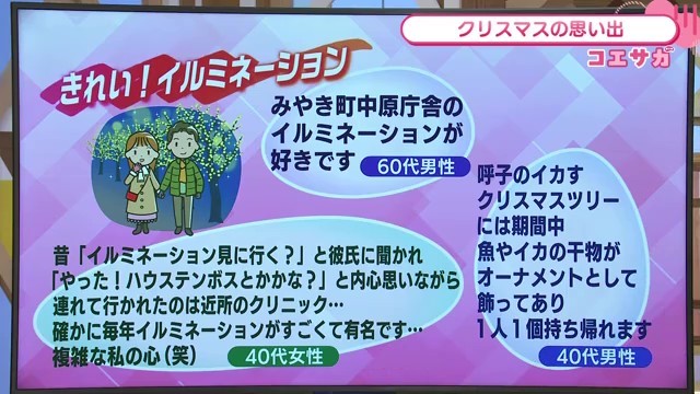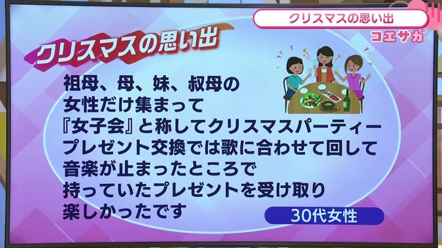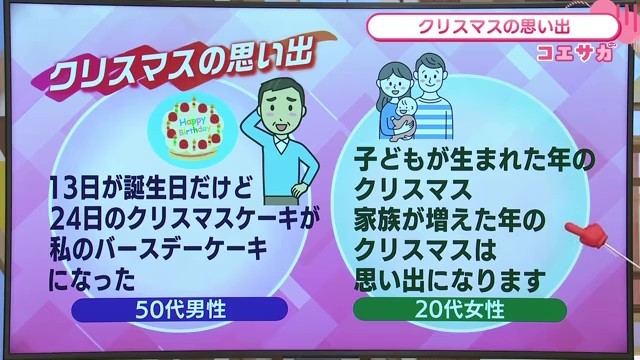 12月も半ばを迎え、佐賀県内でもクリスマスムードが高まっています。サガテレビのコーナー「コエサガ」では、「あなたのクリスマスの思い出は?」をテーマに、佐賀県民の皆さんから寄せられた心温まるエピソードや地元ならではのイルミネーション情報が集まりました。家族との特別な時間、予想外の失敗談、そして佐賀ならではのユニークなイルミネーションスポットまで、笑いあり涙ありの思い出が集まりました。
