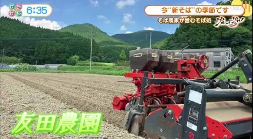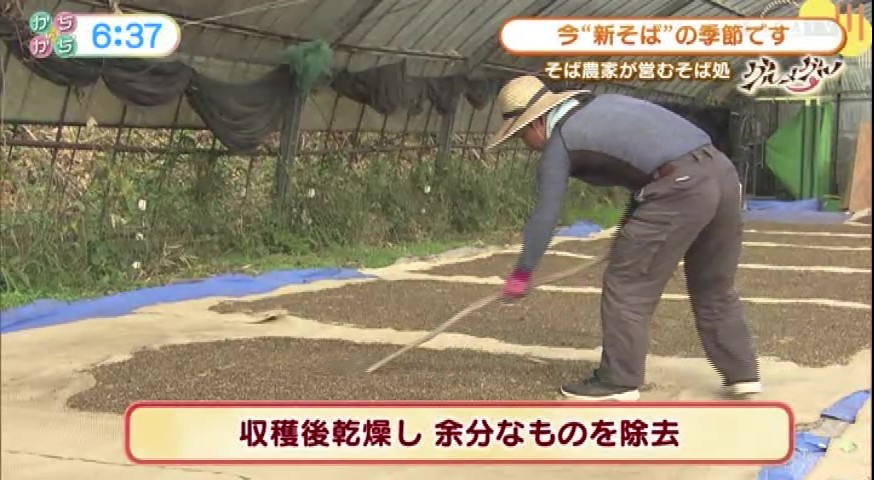 種の乾燥、製粉などの工程を経て、順次新そばが皆さんの元へ運ばれます。撮影日は11月下旬で、ちょうど収穫後の作業が行われていました。「昨日刈り取りをしてきた分が今天日干しをしているところですね。それから乾燥をして、脱穀調整したりして、きれいな実に仕上げていく」作業を友田さんが説明してくれました。