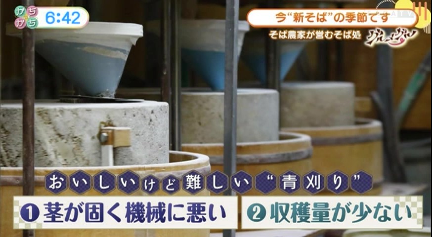 美味しい新そばの裏には苦労もあります。青刈りは「青いと皮も厚くしっかりしてますので、巻き込んでしまうと故障の原因になるんですね。しかも粉にした時の分が少なくなる」と友田さんが説明するように、製粉時に機械への負担が大きく、取れる粉の量も少なくなってしまいます。