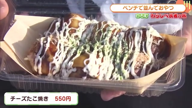 たこ焼きのメニューも充実しており、ソース、ネギ、明太マヨ、チーズなど、様々な味が楽しめます。この日は、チーズたこ焼き(550円)を選びました。