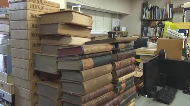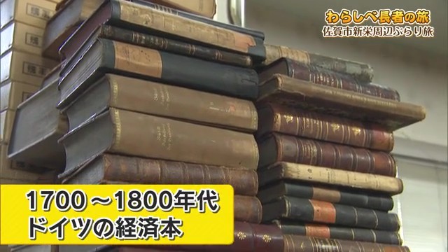 奥の部屋に案内されると、壁一面に古書がぎっしりと並んでいます。「図書館よりあると思う」「奥まで本が詰まってます」とリポーターも圧倒される光景が広がっています。