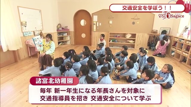 諸富北幼稚園では毎年この時期、佐賀市生活安全課の交通指導員を招いて安全に通学するための教室を開いています。今年も31人の年長さんが参加し、小学校入学前の大切な準備として交通安全を学びました。