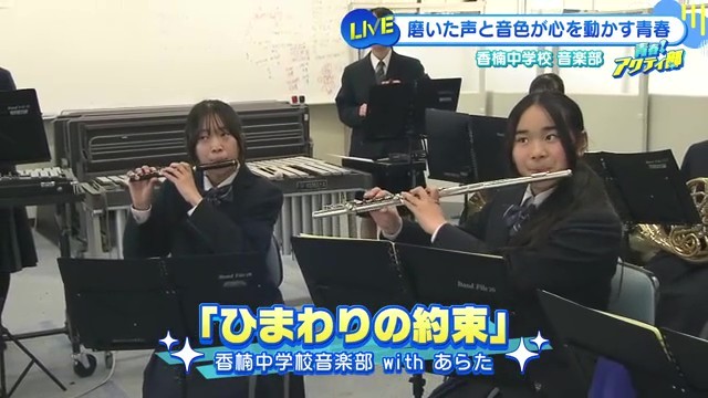 取材のクライマックスとしてリポーターが香楠中学校音楽部とのコラボ演奏に挑戦しました。放送前に早めに学校入りして練習を重ね、指揮者として部員たちと「ひまわりの約束」を披露。