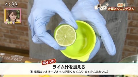 ライム汁を加えて爽やかな味わいにするのがポイント!大葉の味を最大限に活かして大葉とウニのパスタを作ります♪