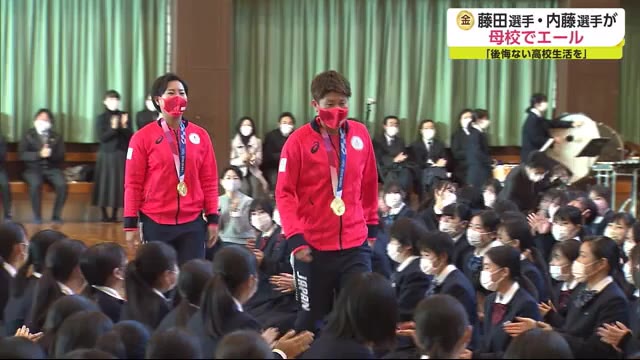 東京オリンピック・ソフトボールで金メダルを獲得した藤田倭選手と内藤実穂選手が13日、母校、佐賀女子高校で後輩たちに金メダルを披露しました。