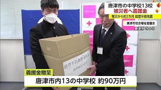 発生から約2カ月となる能登半島地震の被災者支援で、唐津市内13の中学校が市の社会福祉協議会に義援金を贈りました。