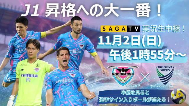 いよいよJ2リーグも終盤戦!近年まれにみる勝ち点差が近い大混戦。上位に位置するサガン鳥栖はJ1昇格まであと一歩という所まで来ている。今節対戦するのは同じく上位に位置する徳島ヴォルティス。勝った方がJ1昇格へと近づける重要な一戦となること必至!2011年のサガン鳥栖J1初昇格の立役者、鳥栖のレジェンド豊田陽平さんを解説に迎え、駅前不動産スタジアムから生中継!番組中に発表するキーワードに答えて豪華商品が当たるプレゼント企画(試合で使用した公式球に選手のサイン入りで)も実施!みんなでサガン鳥栖の勝利を後押ししよう!