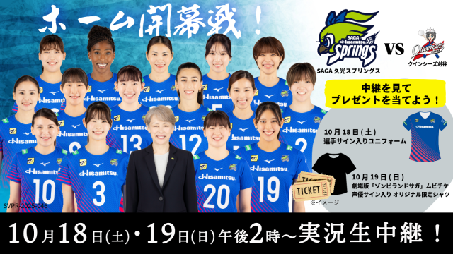 今年はホーム開幕戦を2日連続生中継!今シーズンは中田久美ヘッドコーチが9年ぶりに指揮を執り世界バレーで活躍した荒木・北窓らと共に王座奪還へ!昨季までSAGA久光で指揮をとっていた酒井新悟監督率いるクインシーズ刈谷を迎え撃つ!解説に元日本代表でSAGA久光OGの新鍋理沙さんを迎え実況生中継でお送りします!番組中に発表するキーワードを入力して応募すると豪華商品が当たるプレゼント企画も実施!最後までお見逃しなく!