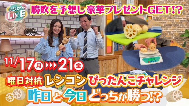 各曜日の出演者の出演者が、佐賀県産レンコンを「ぴったり300g」を目指して量ります。視聴者のみなさんは、前日の曜日の記録と比較して、 “勝つ” or “負ける” の予想を投票してください!